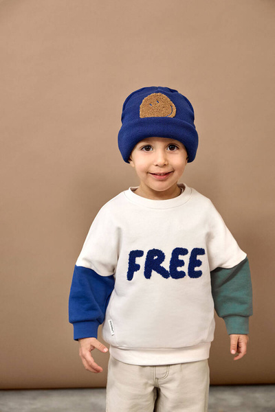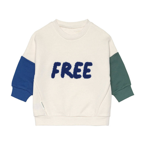 Piękna i komfortowa bluza FREE z kolekcji Little Gang niemieckiej marki LASSIG. Wykonana jest z niezwykle miękkiej, przyjemnej do noszenia, mięsistej bawełny organicznej z certyfiktem GOTS. Idealna na co dzień. Gwarantuje swobodę ruchów i wygodę użytkowania. Ma mleczny biały kolor, jeden rękaw niebieski, drugi w zgaszonej zieleni oraz niebieską, teksturowaną aplikację na przodzie – napis FREE.