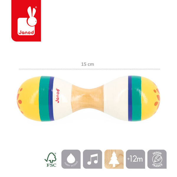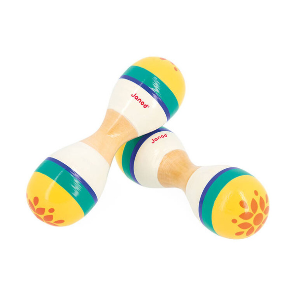 Drewniane podwójne marakasy z serii Gioia francuskiej marki JANOD to idealna pierwsza zabawka muzyczna dla dziecka, która pomaga rozwijać słuch, poczucie rytmu oraz zdolności muzyczne. Wspiera także rozwój wyobraźni, koncentracji, wytrwałości i koordynacji ruchowej. Marakasy mają dwie zaokrąglone główki i wydają piękny dźwięk przy potrząsaniu. Mają również poręczny rozmiar i radosną kolorystykę. Zabawka została zaprojektowana we Francji. Zapakowana jest w estetyczne, kartonowe pudełko. Idealnie nadaje się na prezent.