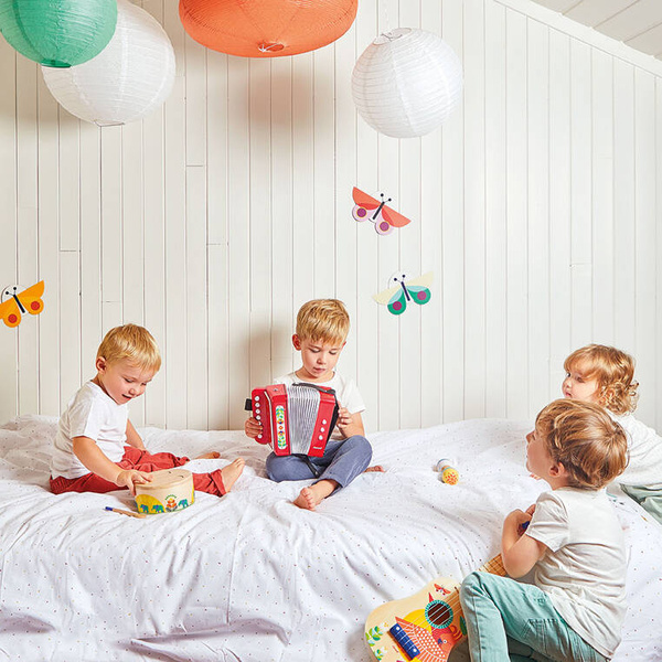 Drewniane ukulele z serii Gioia francuskiej marki JANOD to idealna pierwsza zabawka muzyczna dla dziecka, która pomaga rozwijać słuch, poczucie rytmu oraz zdolności muzyczne. Wspiera także rozwój wyobraźni, koncentracji, wytrwałości i koordynacji ruchowej. Ukulele ma cztery struny, pokrętła do regulacji ich napięcia, poręczny rozmiar i radosną kolorystykę – na pudle namalowane są tropikalne liście, słońce i pomarańczowa papuga. Zabawka została zaprojektowana we Francji. Zapakowana jest w estetyczne, kartonowe pudełko. Idealnie nadaje się na prezent.
