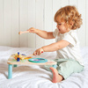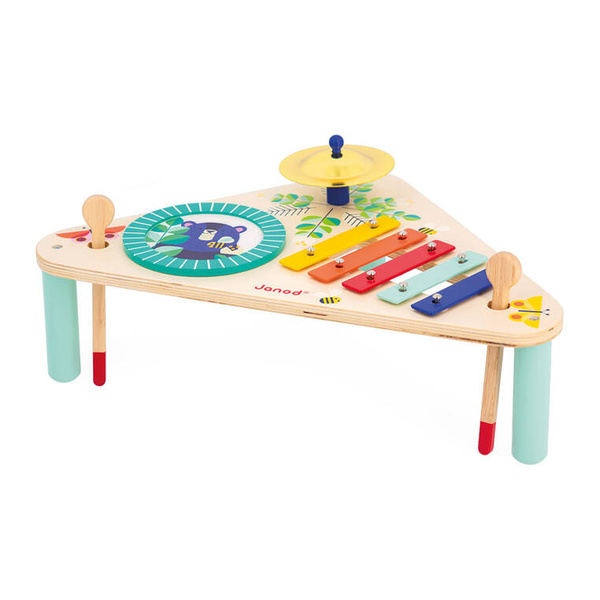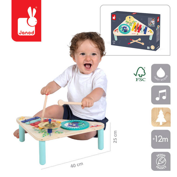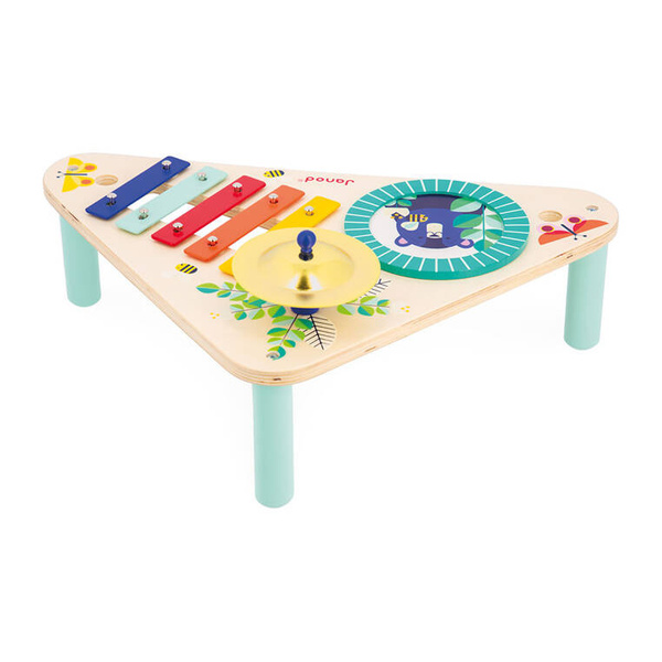Trójkątny stolik muzyczny z serii Gioia francuskiej marki JANOD to idealna pierwsza zabawka muzyczna dla dziecka, która pomaga rozwijać słuch, poczucie rytmu oraz zdolności muzyczne. Wspiera także rozwój wyobraźni, koncentracji, wytrwałości i koordynacji ruchowej. Stolik ma trzy nogi, bezpieczne, zaokrąglone ranty i 3 instrumenty na wyposażeniu: metalowy talerz perkusyjny, ksylofon z pięcioma metalowymi klawiszami (5 tonów) oraz membranę, pełniącą rolę bębenka. W zestawie znajdują się ponadto dwie drewniane pałeczki, a w stoliku – otwory, w których można je umieścić po skończonej zabawie. Każdy instrument brzmi inaczej, dzięki czemu dziecko będzie miało możliwość poznania wielu dźwięków. Zabawkę wyróżnia radosna kolorystyka – na bębenku namalowany jest niedźwiedź, a blat stolika zdobią motywy tropikalnych owadów i roślin. Zabawka została zaprojektowana we Francji. Zapakowana jest w estetyczne, kartonowe pudełko. Idealnie nadaje się na prezent.