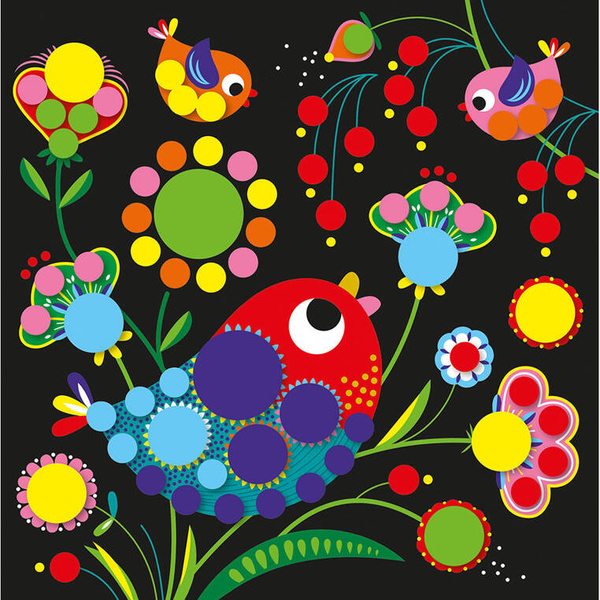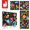 Zestaw kreatywny Okrągłe naklejki z serii My arts & crafts francuskiej marki JANOD zawiera 4 kwadratowe plansze z obrazkami na czarnym tle, które przedstawiają barwną roślinność i zwierzątka typowe dla ogrodów. Do ilustracji tych można – zarówno w sugerowanych miejscach, jak i dowolnie – przyklejać dołączone do zestawu kolorowe piankowe naklejki - kółka różnej wielkości. Naklejanie i zdobienie to dla dziecka długie godziny angażującej i jednocześnie uspokajającej, wyciszającej zabawy.