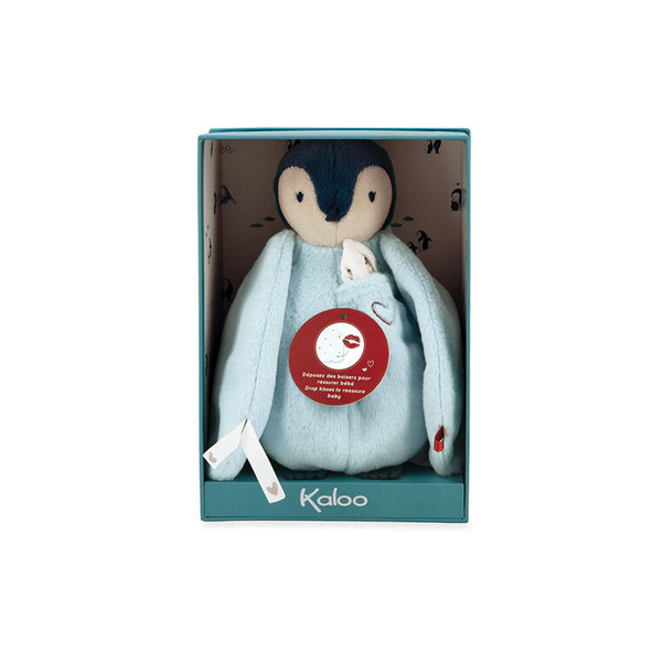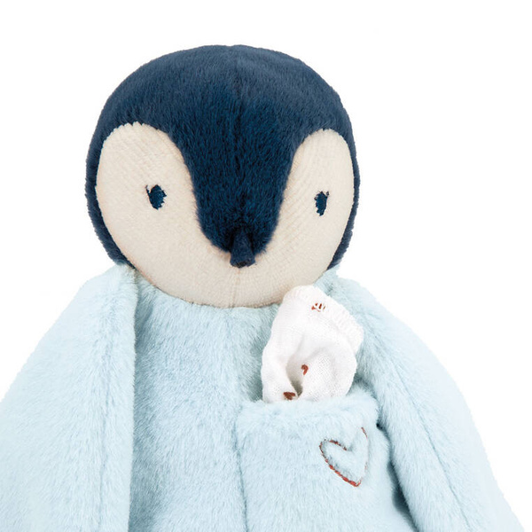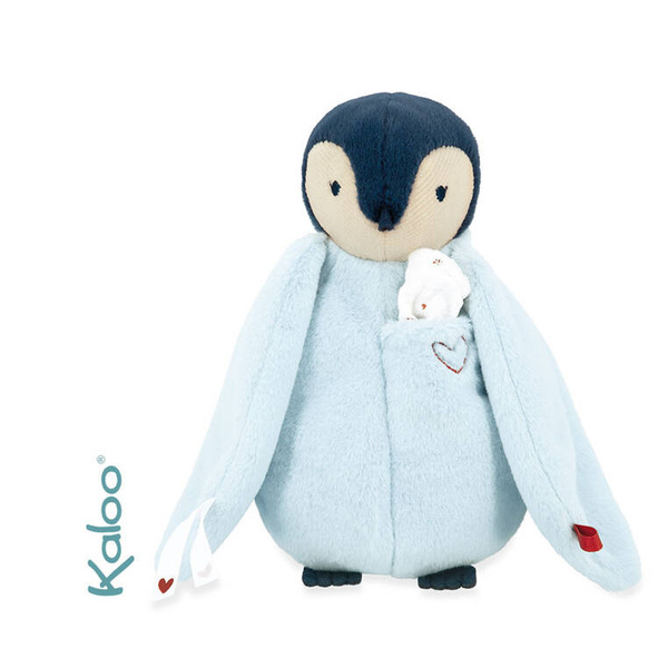 Przeurocza przytulanka Pingwinek z kolekcji Complices francuskiej marki KALOO to idealny pierwszy przyjaciel Twojego maluszka, który przy okazji niesie ważne przesłanie na temat bliskich więzi. Pingwinek jest miękki, piękny, perfekcyjnie wykończony i przede wszystkim całkowicie bezpieczny dla dziecka już od pierwszych dni jego życia. Uszyty z dwóch rodzajów przyjemnych w dotyku tkanin w odcieniach bieli i koloru niebieskiego: futerka i aksamitnego sztruksu. Posiada także filcowe nóżki dodatkowo stymulujące zmysł dotyku. Na wysokości serca ma ukrytą kieszonkę na chusteczkę wykonaną z absorbującego zapachy muślinu, dzięki czemu dziecko może „czuć” rodzica, nawet gdy ten nie jest akurat przy nim. Dodatkowo pingwinek wyposażony jest w tasiemkę z wyhaftowanym serduszkiem – symbolem bliskości, za pomocą której można łączyć jego skrzydełka ze sobą, a także z innymi przytulankami z kolekcji. Stworzony do tulenia, usypiania, uspokajania, zabierania na wyjazdy czy pobyty u dziadków mają ułatwiać maleństwu okresy separacji z rodzicem i wspierać go w budowaniu bezpiecznych więzi.