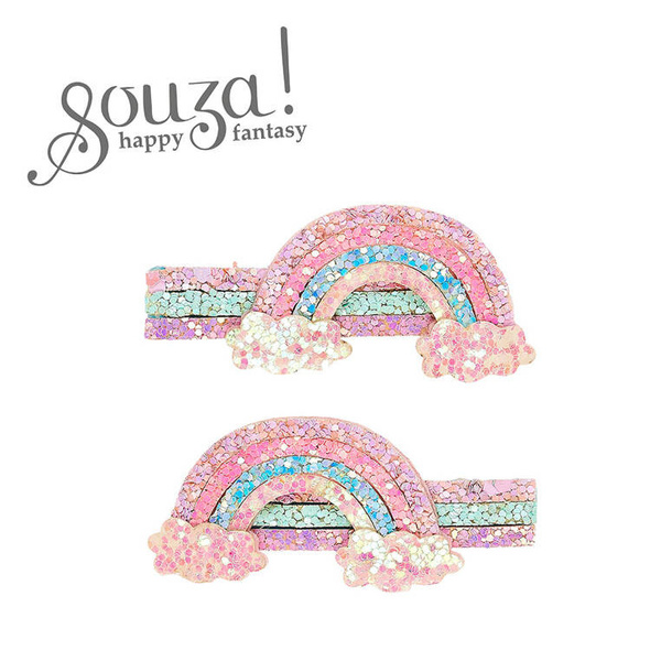 Komplet dwóch spinka do włosów z aplikacją tęczy Djenley holenderskiej marki Souza! Spinki oraz umieszczone na nich czteropasmowe tęcze zakończone chmurkami, pokryte są brokatem w odcieniach różu, fioletu i błękitu. Metalowe zapięcie z ząbkowanym zaciskem sprawia, że ozdoby stabilnie trzymają się włosów. Idealne zarówno na przyjęcia, np. jako uzupełnienie przebrania syrenki, jak i na co dzień. Nadają się także na prezent.