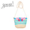 Torebka na ramię dla dzieci Alaia holenderskiej marki Souza! jest poręczna i całkiem pojemna, zapinana na suwak i z długim sznurkiem do przewieszenia przez ramię. Jest pleciona, w naturalnym słomkowym kolorze w trzy niebieskie paski, z niebieskimi oraz różowymi pomponami i chwostami przy górnym brzegu. Pomieści niezbędne drobiazgi. Idealna jako dodatek do letniego, plażowego stroju czy na przyjęcia, i do noszenia na co dzień. Nadaje się także na prezent.
