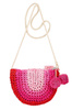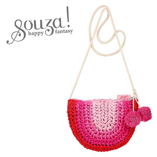 Torebka na ramię dla dzieci Alies holenderskiej marki Souza! jest poręczna i całkiem pojemna, półokrągła, zamykana na suwak i z długim (ok. 50 cm) sznurkiem do przewieszenia przez ramię. Jest pleciona, w odcieniach czerwieni i różu, a przy jednym z boków ma dwa ozdobne pompony na sznureczkach. Pomieści niezbędne drobiazgi. Idealna jako dodatek do letniego, plażowego stroju czy na przyjęcia, i do noszenia na co dzień. Nadaje się także na prezent.