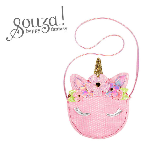 Torebka na ramię dla dzieci Anette holenderskiej marki Souza! jest poręczna i całkiem pojemna, zapinana na suwak i z długim (ok. 50 cm) wąskim paskiem do przewieszenia przez ramię. Jest pleciona, w kolorze różowym i ma okrągły kształt. Zdobią ją uszy, złoty róg jednorożca, kwiatowe aplikacje i naszyte z przodu srebrne zamknięte powieki. Pomieści niezbędne drobiazgi. Idealna jako dodatek do stroju wizytowego, np. na przyjęcia, jak i do noszenia na co dzień. Nadaje się także na prezent.
