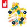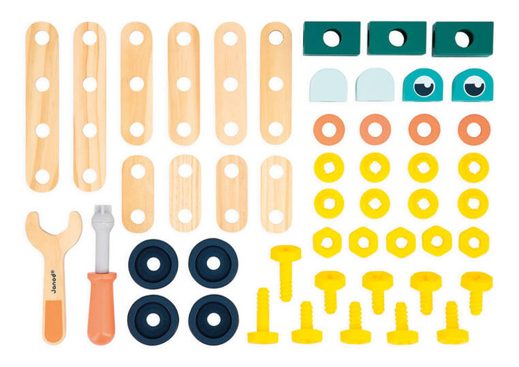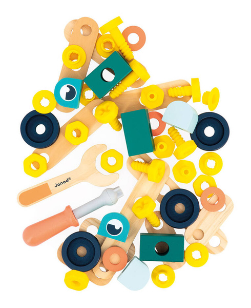 50-elementowy zestaw konstruktora z kolekcji Brico'kids francuskiej marki JANOD to idealny prezent dla małego majsterkowicza. Dzięki różnorodnym drewnianym elementom zabawka wspomaga rozwój dziecka na wielu płaszczyznach: rozwija zdolności manualne, cierpliwość, koncentrację, a także stymuluje wyobraźnię i umiejętności społeczne, zachęcając do odgrywania scen, imitujących zachowanie dorosłych. W skład zestawu wchodzą elementy drewniane, elementy plastikowe (podkładki, nakrętki, śrubki), 4 gumowe kółka oraz śrubokręt i klucz. Dołączono do niego również 10 kart z propozycjami konstrukcji do zbudowania. Dzięki sporej ilości akcesoriów zabawką może bawić się jednocześnie więcej niż jedno dziecko. Zestaw zaprojektowany został we Francji. Zapakowany jest w estetyczne pudełko. Idealnie nadaje się na prezent.