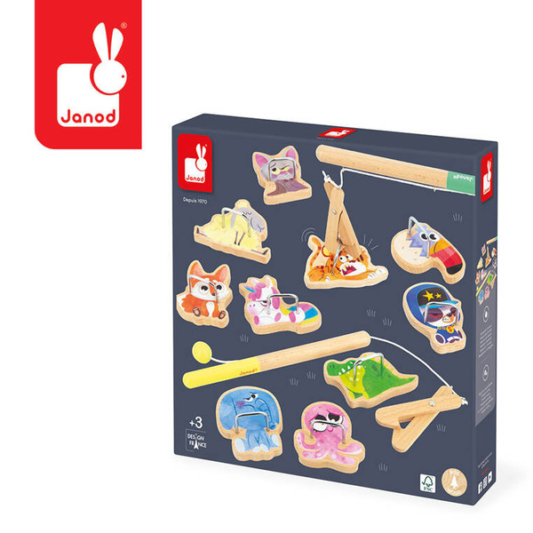 Gra zręcznościowa Łowienie rybek z kolekcji Applepop francuskiej marki JANOD to wspaniała zabawa dla dwójki dzieci lub dziecka i rodzica. W skład zestawu wchodzą dwie drewniane wędki z klipsami na końcach oraz 10 szalonych zwierząt do wyłapania. Drewniane figurki mają spore metalowe uchwyty, dzięki którym dają się złapać na klips. Celem gry jest złowienie jak największej ilości stworzeń. Gracz, który zgromadzi ich więcej – wygrywa. Gra ćwiczy koordynację ruchową, wspiera relację ręka-oko, uczy cierpliwości i skupienia.