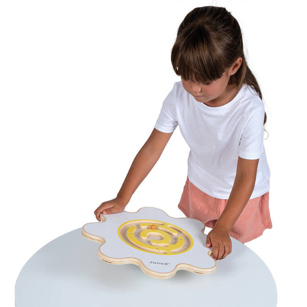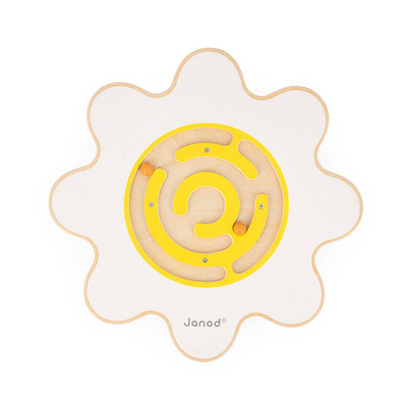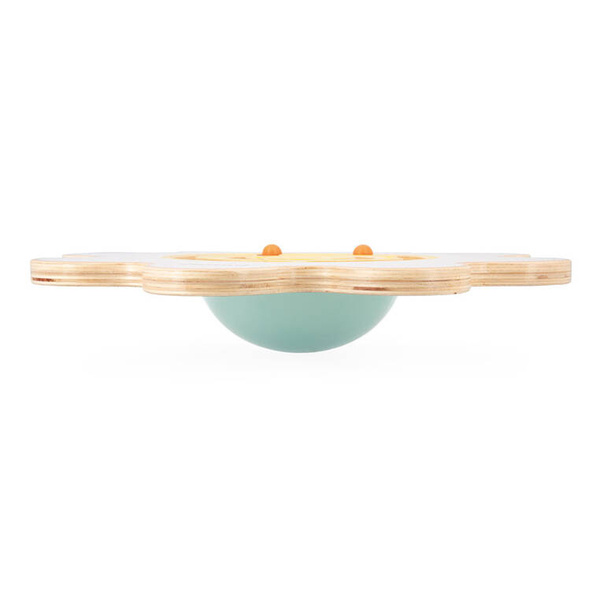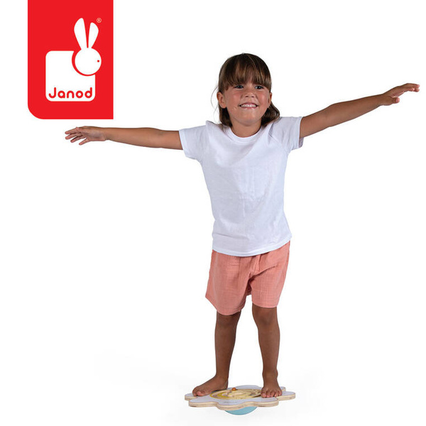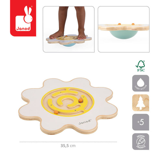 Deska do balansowania Kwiat z kolekcji Sweet Cocoon francuskiej marki JANOD wspiera dziecko w ogólnym rozwoju motorycznym. Balansująca na półkolistym spodzie deska ma kształt kwiatu z zaokrąglonymi brzegami, białymi płatkami i żółtym labiryntem z dwoma kulkami do przesuwania w środku. Kulki można przemieszczać rękami lub bujając deską na boki. Można także stać na niej i starać się utrzymać równowagę. Zabawkę można ponadto wykorzystywać na inne sposoby, jakie tylko podpowie dziecku wyobraźnia. Maksymalne obciążenie deski to 50 kg.