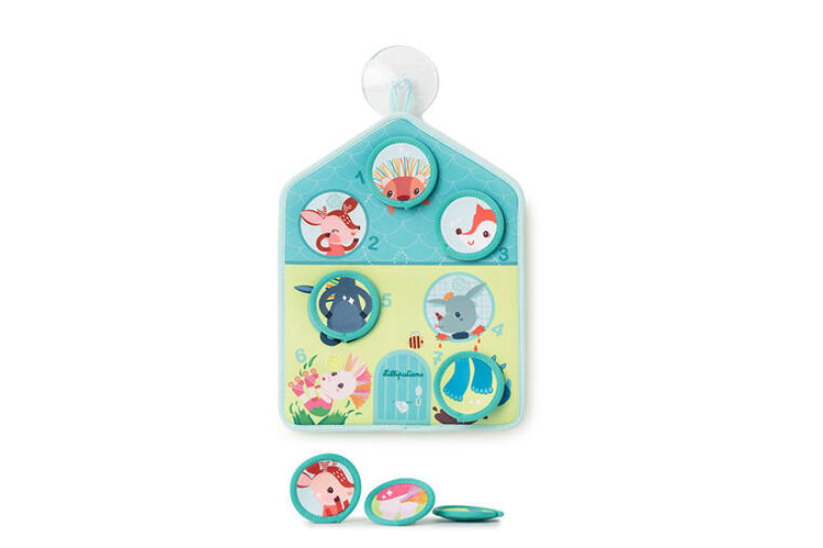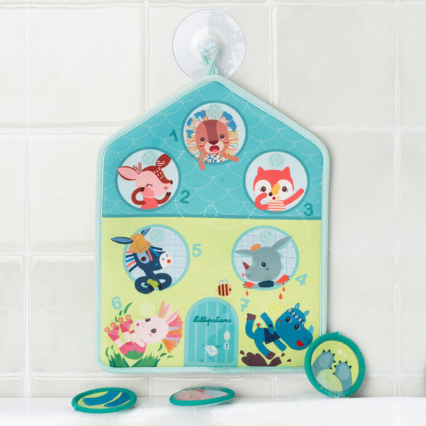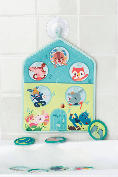 Edukacyjna mata do wanny belgijskiej marki Lilliputiens to idealna zabawka do kąpieli. Wykonana z miękkiego, łatwego do czyszczenia i szybkoschnącego materiału. W skład zestawu wchodzi tablica w kształcie domku z solidną przyssawką oraz 7 okrągłych żetonów-obrazków, które można na niej mocować na rzep. Obrazki na żetonach przedstawiają lśniące czystością części ciała różnych zwierzątek, które należy odpowiednio dopasować do ich zdjęć ich właścicieli, znajdujących się na tablicy. Dodatkowo do każdej ilustracji na domku przyporządkowana jest cyfra, dzięki czemu dziecko podczas zabawy może ćwiczyć naukę liczenia do 7. Wszystkie elementy unoszą się na wodzie. Zabawka jest perfekcyjnie wykończona, z dbałością o każdy szczegół i w pełni bezpieczna dla dziecka. Rozwija sprawność motoryczną i koordynację ręka-oko.