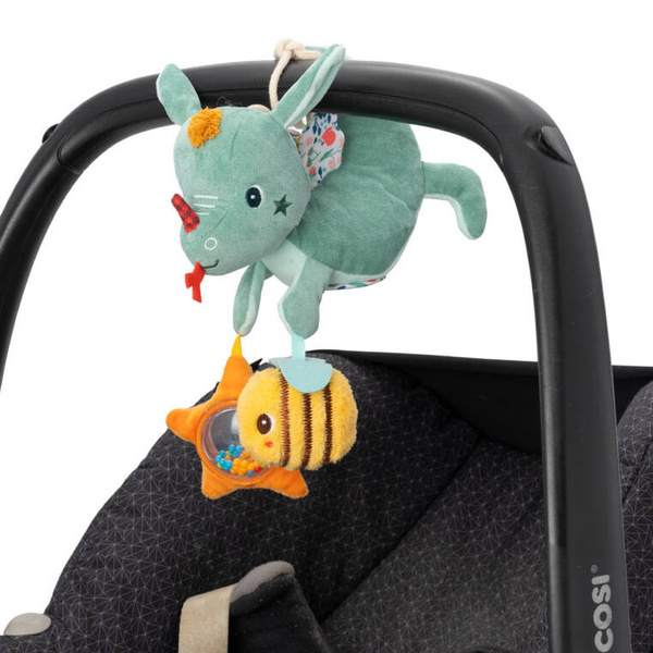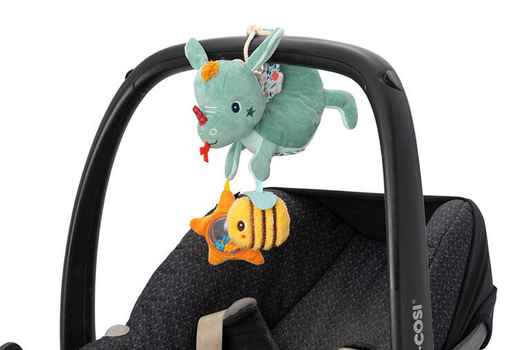 Wielofunkcyjna przytulanka do powieszenia z kolekcji Smok Joe belgijskiej marki Lilliputiens to idealna pierwsza zabawka dla niemowląt. Ma postać wielofunkcyjnego smoka i przeznaczona jest do zabrania ze sobą w mniejszą czy większą podróż. Tył tułowia Joe szeleści przy pocieraniu, głowa jest grzechotką, przy jednej z łapek znajduje się szeleszczaca pszczłóka, przy drugiej gwiazda z transparentną grzechotką z kuleczkami, a na brzuszku – miękkie lusterko. Zmysł dotyku pobudzają ponadto liczne odstające elementy: skrzydła, grzywa, róg na nosie, filcowy języczek i spore uszka. Zawieszkę można przywiązać w dowolnym miejscu za pomocą znajdujących się na plecach sznurków. Można ją mocować np. przy łóżku, pałąku, wózku, nosidełku czy foteliku samochodowym, umilając maluszkowi podróż. Jest solidnie wykonana i w pełni bezpieczna. Rozwija małą motorykę (chwytanie, potrząsanie, pocieranie), aktywizuje zmysł słuchu (szeleści, grzechocze), wzroku (lusterko) i dotyku.
