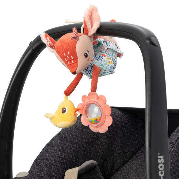 Wielofunkcyjna przytulanka do powieszenia z kolekcji Sarenka Stella belgijskiej marki Lilliputiens to idealna pierwsza zabawka dla niemowląt. Ma postać wielofunkcyjnej sarenki i przeznaczona jest do zabrania ze sobą w mniejszą czy większą podróż. Tył tułowia Stelli szeleści przy pocieraniu, głowa jest grzechotką, przy jednej z łapek znajduje się szeleszczący ptaszek, przy drugiej kwiatek z transparentną grzechotką z kuleczkami, a na brzuszku – miękkie lusterko. Zmysł dotyku pobudzają ponadto liczne odstające elementy: uszka, różki i brzeg sukienki. Zawieszkę można przywiązać w dowolnym miejscu za pomocą znajdujących się na plecach sznurków. Można ją mocować przy łóżku, pałąku, wózku, nosidełku czy foteliku samochodowym, umilając maluszkowi podróż. Jest solidnie wykonana i w pełni bezpieczna. Rozwija małą motorykę (chwytanie, potrząsanie, pocieranie), aktywizuje zmysł słuchu (szeleści, grzechocze), wzroku (lusterko) i dotyku.