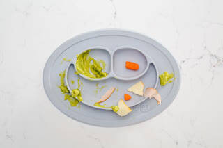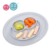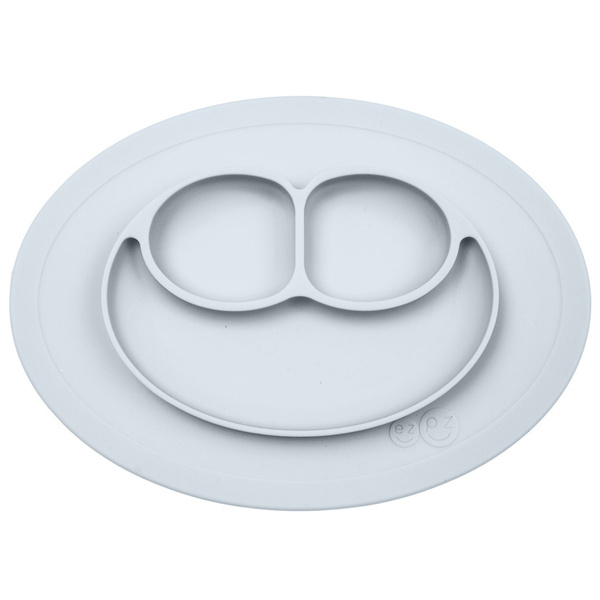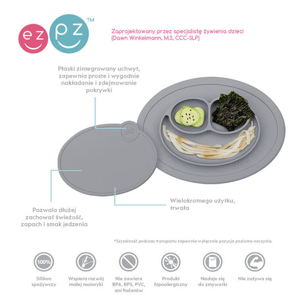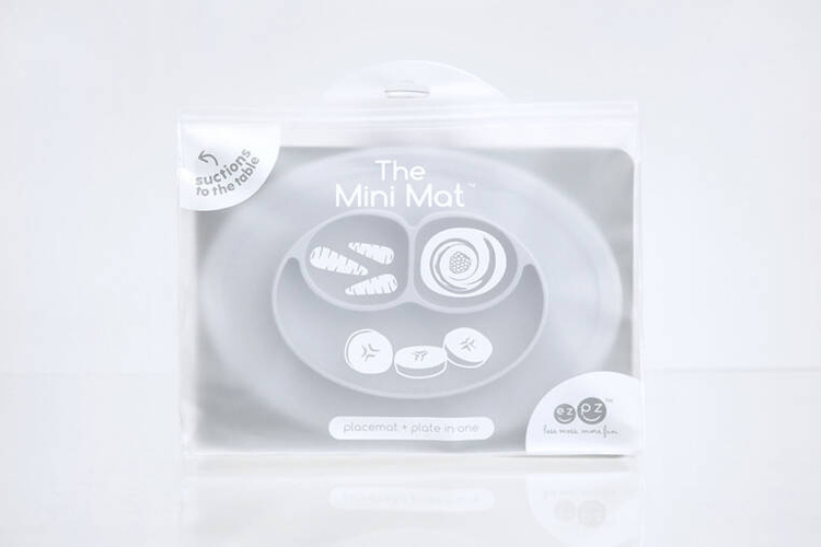 Mini Mat amerykańskiej marki EZPZ (czyt. izipizi) to nieduża, poręczna podkładka i trójdzielny talerzyk w jednym, stworzony z najbezpieczniejszego silikonu. Pasuje do większości blatów krzesełek do karmienia. Dzięki zamykanemu opakowaniu, jest to idealne rozwiązanie na podróż. Innowacyjna silikonowa podkładka mocno przywiera do stołu czy innej gładkiej powierzchni, na której ją położysz. Dzięki temu małe dziecko nie jest w stanie jej przesunąć czy zrzucić. Ma owalny kształt, estetyczny wygląd i ładny, pastelowy kolor. Trójdzielny talerz pozwala dzielić posiłki na porcje, co ułatwia malcowi naukę samodzielnego jedzenia, a z czasem także – rozpoznawanie kategorii pokarmów. Pojemność talerzyka jest idealna na początkowe posiłki: 2 razy 60 ml i 120 ml. Nadaje się do serwowania zarówno zimnych, jak i ciepłych potraw. Niewielkie rozmiary Mini Mat sprawiają, że doskonale sprawdza się na spacerze, w podróży czy w restauracji, mieści się też w większości standardowych torebek. Do maty dołączone jest ponadto opakowanie, dzięki któremu przenoszenie jej w torebce jest całkowicie higieniczne.