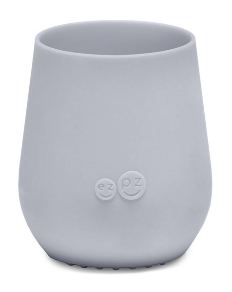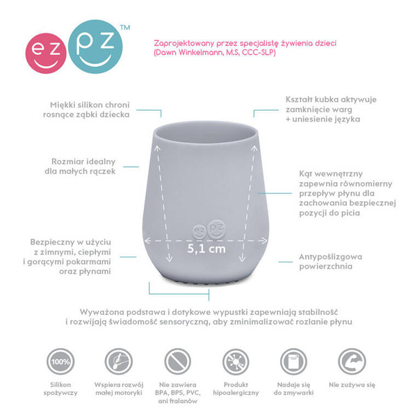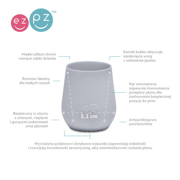 Tiny Cup to wykonany z silikonu, pierwszy kubeczek Twojego dziecka. Przeznaczony jest dla dzieci od 4. - 6. miesiąca życia (w zależności od gotowości dziecka do podjęcia nauki picia z kubeczka, oraz zaleceń lekarza pediatry). Innowacyjny kubeczek został zaprojektowany przez specjalistę w dziedzinie logopedii i żywienia dzieci tak, aby ułatwić maluszkowi przejście z picia z butelki na kubeczek oraz korzystnie wpływać na jego rozwój. Nauka picia z otwartego naczynia to dla malca istotny krok rozwojowy. Unikatowy kształt kubeczka jest doskonale dopasowany do ust małego dziecka, co ważne - aktywuje on automatyczne zamknięcie warg i uniesienie języka. Kąt pochylenia płaszczyzny wewnątrz zapewnia równomierny przepływ płynu i zachowanie bezpiecznej pozycji podczas picia, minimalizując ryzyko zadławienia. Wielkość kubka dostosowana jest perfekcyjnie do małych rączek. Jego antypoślizgowa powierzchnia sprawia, że dziecko bez trudu utrzyma go w dłoniach i uniesie do ust. Odpowiednio szeroka i wyważona podstawa z wypustkami nie tylko gwarantuje stabilność naczynia, minimalizując ryzyko przewrócenia kubeczka i rozlania płynu, ale też wspiera rozwój sensoryczny dziecka, stymulując zmysł dotyku.