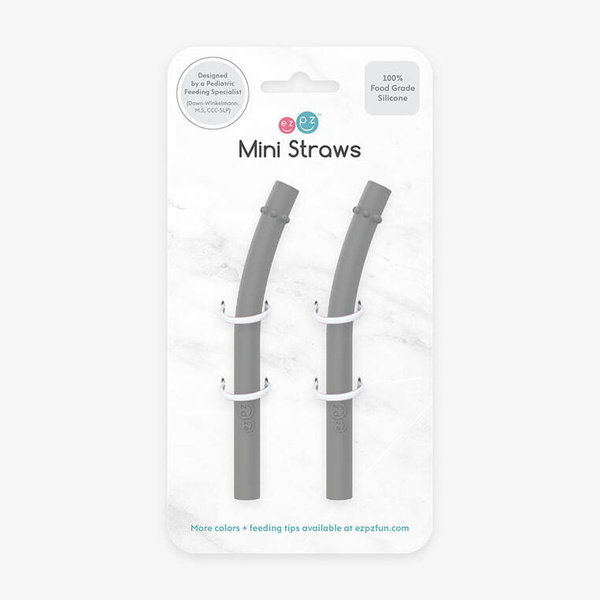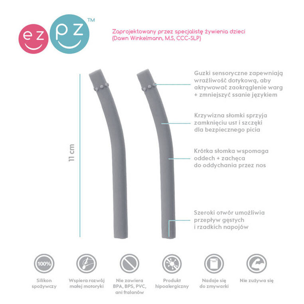 Dwie dodatkowe silikonowe słomki dedykowane są do kubeczka Mini Cup jako praktyczne akcesorium, ułatwiające korzystanie z naczynka – dzięki nim nie musisz się denerwować ewentualnym zapodzianiem się lub zgubieniem słomki, nie musisz jej też zmywać przy każdej zmianie napoju. Słomki zostały zaprojektowane przez specjalistę w dziedzinie logopedii i żywienia tak, aby ułatwić maluszkowi naukę samodzielnego picia. Ich unikalny kształt jest doskonale dopasowany do ust i potrzeb małego człowieka. Wygięcie oraz sensoryczne wypustki w górnej części aktywują automatyczne domknięcie warg i szczęki, a optymalna długość wspiera naukę oddychania przez nos i normalizacji oddechu. Kolejnym etapem, po opanowaniu umiejętności picia przez zakrzywiony koniec słomki, jest nauka picia przez prostą słomkę – do tego służy drugi koniec bez wypustek. Szeroki przepływ (średnica słomki to niemal 1 cm!) umożliwia spożywanie napojów o zróżnicowanej gęstości. Co ważne, zaokrąglanie warg podczas używania słomki sprzyja postępom w kształtowaniu się i używaniu aparatu mowy.