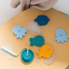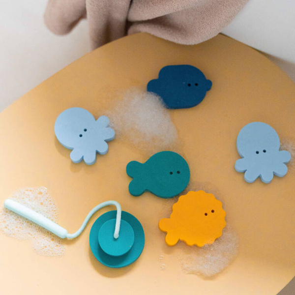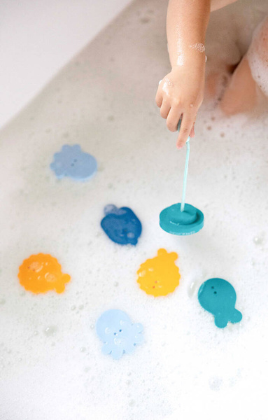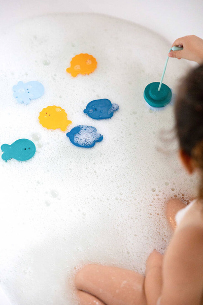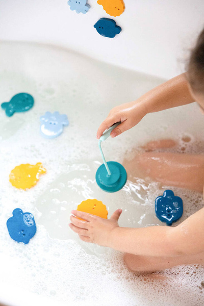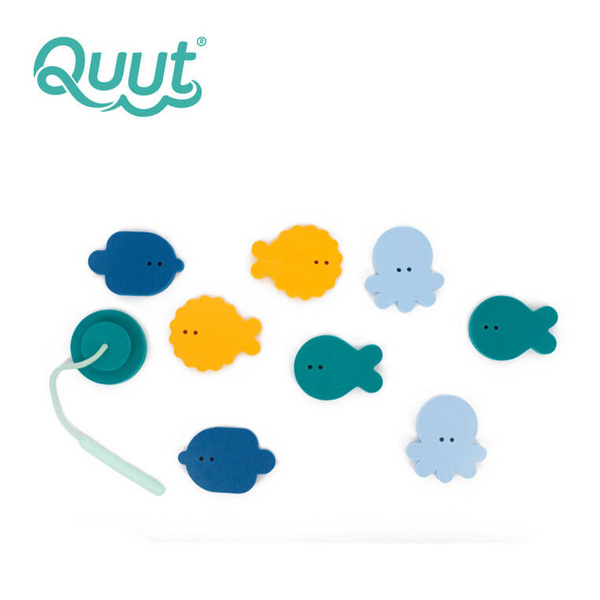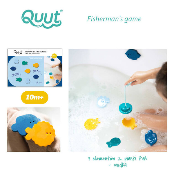Zestaw piankowych naklejek do kąpieli z wędką Deep sea belgijskiej marki Quut to idealna rozrywka na czas kąpieli, która zachwyca pomysłowością, rozwija małą motorykę, koordynację ręka-oko i kreatywność, a ponadto przyciąga wzrok niebanalnym designem i kolorystyką. Komplet składa się z 9 elementów – 8 kolorowych naklejek w kształcie morskich stworzeń wykonanych z pianki EVA oraz „wędki” do ich łowienia, tj. sznurka z silikonową rączką i krążkiem z pianki na końcu. Dziecko początkowo może przyklejać rybki czy ośmiornice na powierzchni wanny lub glazury (od ok. 10 miesiąca życia) lub wyławiać je z wody (od ok. 18 miesiąca życia). Naklejki wykonane z pianki przyklejają się po zamoczeniu. Wszystkie elementy unoszą się na wodzie, są lekkie i szybkoschnące.