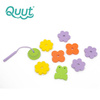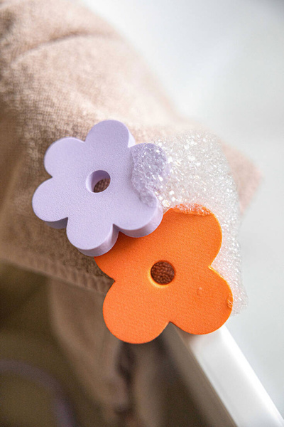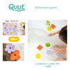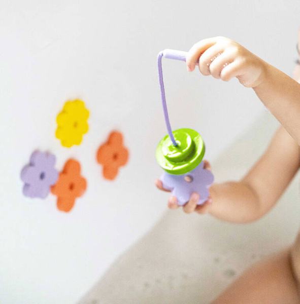 Zestaw piankowych naklejek do kąpieli z wędką Frog pond belgijskiej marki Quut to idealna rozrywka na czas kąpieli, która zachwyca pomysłowością, rozwija małą motorykę, koordynację ręka-oko i kreatywność, a ponadto przyciąga wzrok niebanalnym designem i kolorystyką. Komplet składa się z 9 elementów – 8 kolorowych naklejek w kształcie kwiatów i żabki wykonanych z pianki EVA oraz „wędki” do ich łowienia, tj. sznurka z silikonową rączką i krążkiem z pianki na końcu. Dziecko może przyklejać żabkę oraz kwiaty na powierzchni wanny lub glazury (od ok. 10 miesiąca życia) lub wyławiać je z wody (od ok. 18 miesiąca życia). Naklejki wykonane z pianki przyklejają się po zamoczeniu. Wszystkie elementy unoszą się na wodzie, są lekkie i szybkoschnące.
