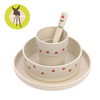 Komplet pięknych naczyń z kolekcji Happy Rascals niemieckiej marki LASSIG. W jego skład wchodzi spory talerz, miska, kubek i łyżeczka – wszystkie elementy utrzymane w bardzo jasnym odcieniu beżu, na spodzie talerza znajduje się czerwona grafika – uśmiechnięte serduszko, takie same małe serduszka zdobią zewnętrzny brzeg kubka i miseczki, na której dnie z kolei widnieje tęcza. Na uchwycie łyżeczki znajduje się zaś serduszko i kilka kreseczek. Zestaw wykonany został z najwyższej jakości materiałów – połączenia polipropylenu z celulozą – solidnych, odpornych, nietłukących się i odpowiednich do kontaktu z pożywieniem. Naczynia posiadają antypoślizgowe wykończenie na spodzie, a łyżeczka – odpowiednio wyprofilowany chwyt i główkę. Zestaw jest idealny dla dzieci powyżej 1. roku życia, które uczą się pić i jeść samodzielnie (co ułatwia im m. in. wyższy brzeg i węższy dół naczyń). Komplet jest zapakowany w ładne kartonowe pudełko, idealne na prezent. Stanowi część większej kolekcji. Możesz dobrać do niego inny produkt z tym samym motywem lub w tej samej gamie kolorystycznej. Wszystkie elementy można myć w zmywarce i podgrzewać w kuchence mikrofalowej.