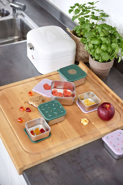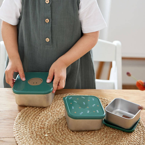 Komplet trzech pojemników na przekąski – snackbox'ów niemieckiej marki LASSIG, wykonanych ze stali nierdzewnej z pokrywkami z wysokiej jakości polipropylenu. Są funkcjonalne, lekkie, dość pojemne i mają kwadratowy kształt. Pudełeczka są w trzech poręcznych wielkościach: 8,9 x 8,9 x 4,5 cm, 10,3 x 10,3 x 5,1 cm oraz 11,8 x 11,8 x 5,5 cm. Idealne do przechowywania i przenoszenia przekąsek lub posiłków w porcjach, odpowiednich dla dziecka. Można je włożyć jeden w drugi, dzięki czemu zajmują mało miejsca. Boxy są srebrne, a ich pokrywki – w ciemnym odcieniu zieleni z grafikami: karmelową uśmiechniętą buźką, tęczą i napisami. Snackboxy stanowią część większej kolekcji Happy Rascals. Możesz dobrać do nich inny produkt w tej samej gamie kolorystycznej lub z tym samym motywem.