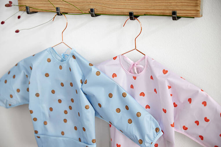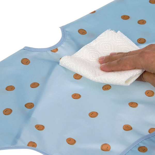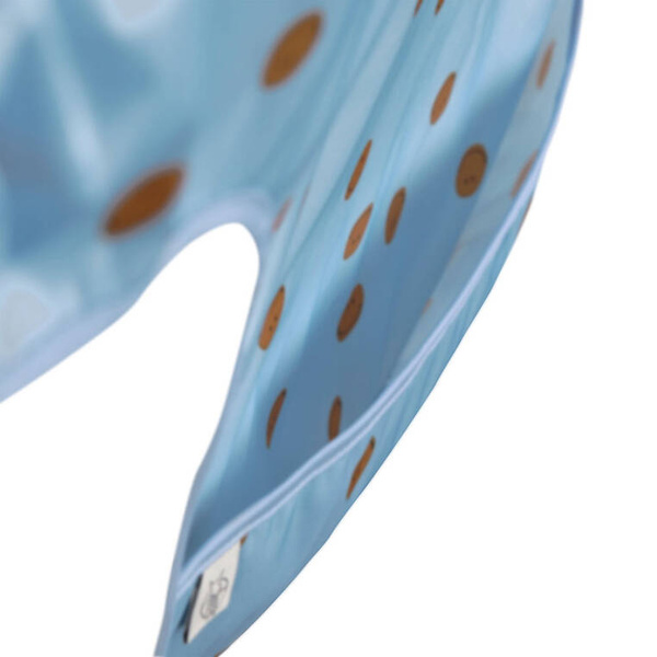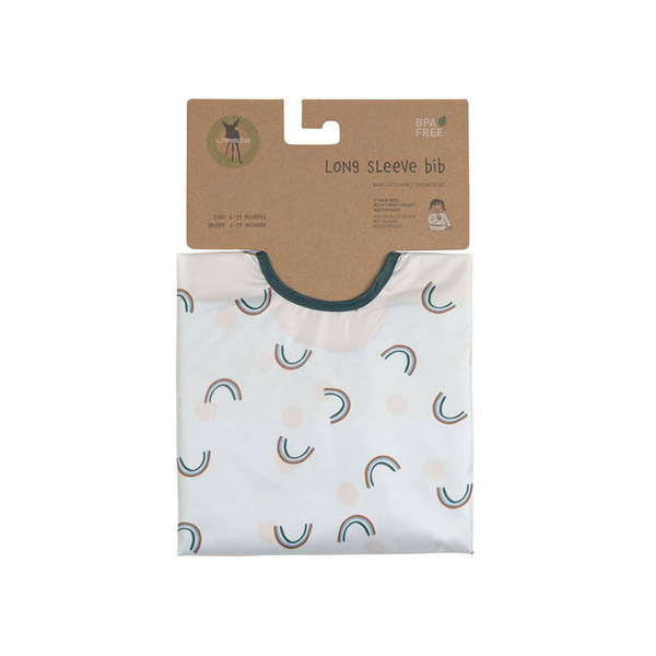Zestaw dwóch praktycznych, łatwo zmywalnych śliniaków niemieckiej marki LASSIG. Są duże, wykonane z wodoodpornego tworzywa – jeden jasnoniebieski w karmelowe uśmiechnięte buźki, drugi jasny z ciemnozielonym obszyciem w multiprint z tęczą. Mają długie rękawy, miękką taśmę i wiązanie na tasiemki, a na dole funkcjonalną kieszonkę. Przeznaczone są dla dzieci od 6. do 24. miesiąca życia. Sprawdzą się nie tylko podczas karmienia malucha, ale też przy każdej twórczej aktywności dziecka: malowaniu, lepieniu z gliny, zabaw plasteliną czy prób samodzielnego przygotowania posiłku. Wygodne, nie krępują ruchów, dobrze przylegają do ubrań. Stanowią część większej kolekcji Happy Rascals. Możesz dobrać do nich inny produkt w tej samej gamie kolorystycznej lub z tym samym motywem.