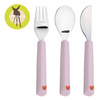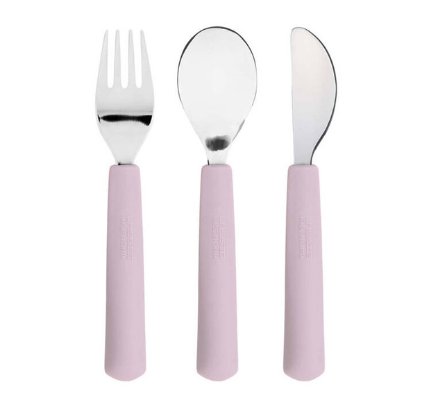Komplet sztućców ze stali nierdzewnej niemieckiej marki LASSIG, składający się z widelca, łyżki i noża. Są lekkie i mają specjalnie profilowane kształty, co ułatwia dzieciom nabieranie pożywienia. Jasno lawendowa rękojeść z silikonu z czerwoną grafiką uśmiechniętego serduszka zaprojektowana została tak, by idealnie pasować do dziecięcej rączki. Jej ergonomiczny kształt sprawia, że łatwo ją złapać i utrzymać, co wspiera rozwój samodzielności malucha. Sztućce stanowią część większej kolekcji Happy Rascals. Możesz dobrać do nich inny produkt w tej samej gamie kolorystycznej lub z tym samym motywem.