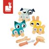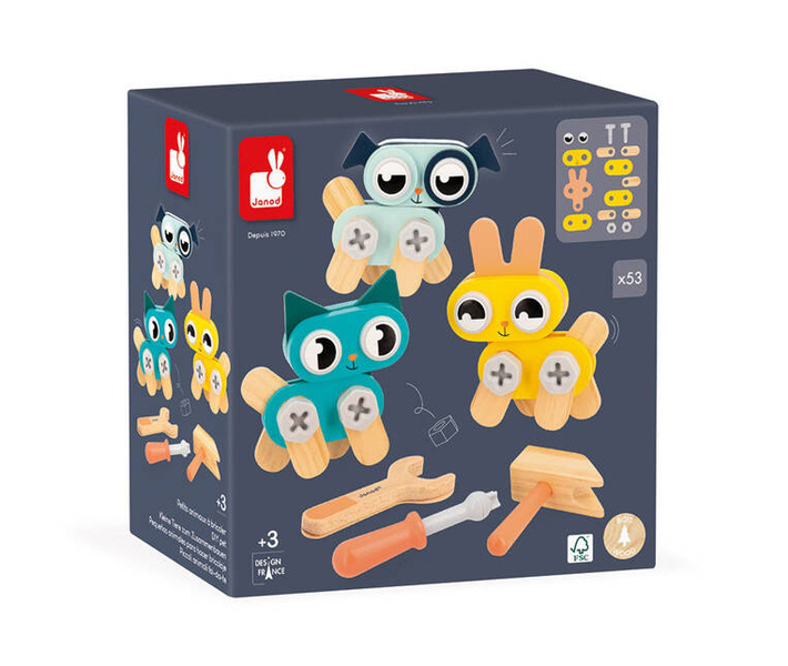 Drewniane zwierzątka do samodzielnego składania z narzędziami z serii Brico'kids francuskiej marki JANOD to idealny prezent dla małego majsterkowicza. Zestaw składa się z 53 elementów – części do zbudowania trzech uroczych zwierzątek (kotka, pieska i króliczka), śrubek, nakrętek, nakładek oraz niezbędnych narzędzi – śrubokręta, klucza i młotka. Zabawka wspomaga rozwój dziecka na wielu płaszczyznach: rozwija zdolności manualne, precyzję ruchów, cierpliwość, koncentrację, stymuluje wyobraźnię i zachęca do tworzenia historii oraz odgrywania sytuacji, znanych z obserwacji dorosłych. Gotowe zwierzątka mogą stać się piękną ozdobą dziecięcego pokoju.