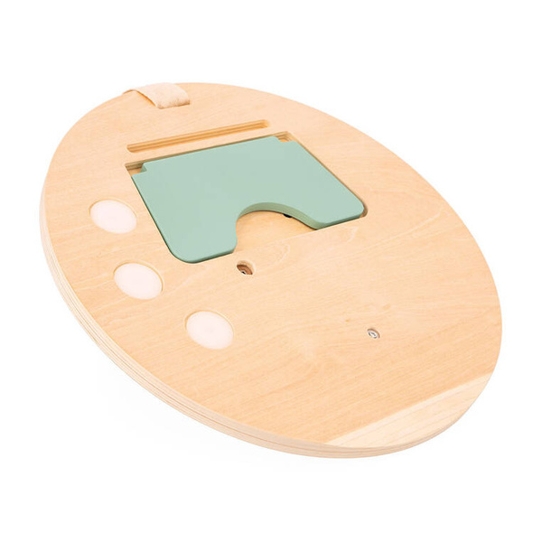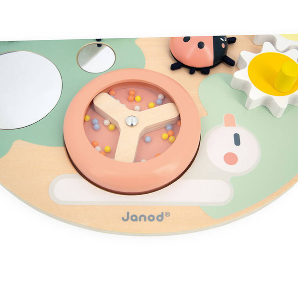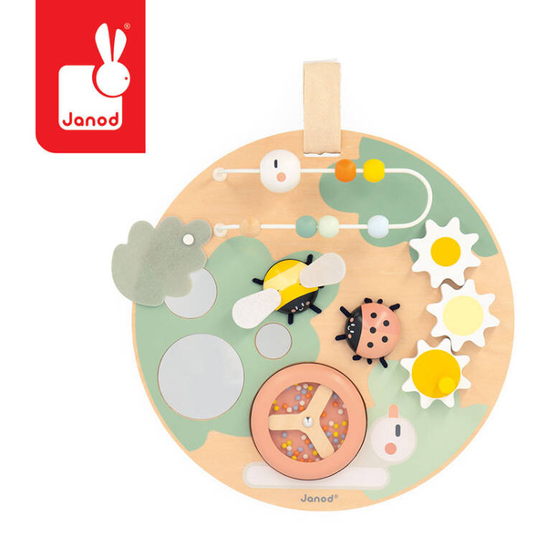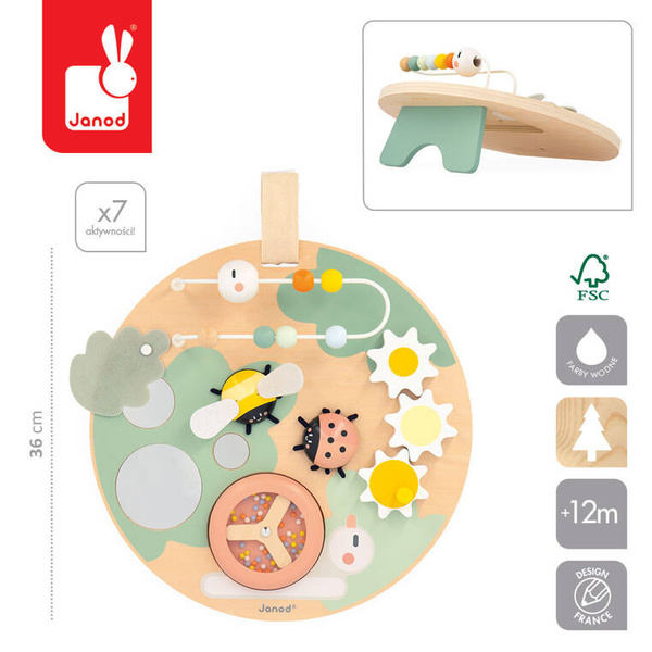 Drewniana wielofunkcyjna tablica edukacyjna Ogród z serii Sweet Cocoon francuskiej marki JANOD to idealna zabawka dla dzieci od 1. roku życia. Ma bezpieczny okrągły kształt, możliwość mocowania jej pionowo na szerokim rzepie lub ustawienia w pozycji pochylonej na jednej stabilnej podpórce. Zachwyca estetyką wykonania i pięknymi kolorami. Elementy na tablicy tworzą urokliwy mikroświat, w którym znajduje się pętla z 7 kulkami do przesuwania (złączone stanowią dżdżownicę), 3 kółka zębate-kwiatki, dwa wkręty-biedronki, w tym jedna ze skrzydełkami, obracane kółko-grzechotka z kulkami, która jest jednocześnie skorupką ślimaka, 3 lusterka, listek dębu przypinany na napę. Zabawka rozwija koordynację ruchową i małą motorykę, trenuje pamięć i logiczne myślenie, uczy rozróżniać kolory, a nawet zauważać zależności przyczynowo-skutkowe. Wiele różnorodnych funkcji sprawia, że się nie nudzi, a kolory (jasnego drewna, szarości i bieli z elementami pastelowej zieleni, odcieni niebieskiego, żółtego, pomarańczowego i zgaszonego różu) – zachwycają.