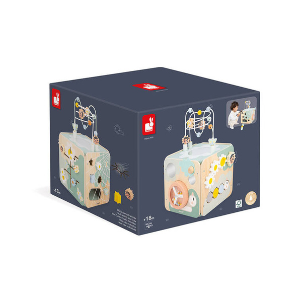 Duża drewniana wielofunkcyjna kostka edukacyjna Ogród z serii Sweet Cocoon francuskiej marki JANOD to idealna zabawka od 18. miesiąca życia. Ma bezpieczny kształt z zaokrąglonymi brzegami. Zachwyca estetyką wykonania i pięknymi kolorami. Elementy na jej ściankach tworzą urokliwy mikroświat, w którym znajdują się dwie pętle z kulkami i owadami do przesuwania, lusterko, 4 kółka zębate – kwiatki i biedronka, gąsienica z 4 obracanymi elementami, drzewo-labirynt z 6-cioma elementami do przesuwania we właściwe miejsce, obracane kółko-grzechotka z kulkami, listek dębu przypinany na napę, sorter kształtów z bryłami do dopasowania czy odczepiany pająk z kółeczkiem od spodu. Zabawka rozwija koordynację ruchową i małą motorykę, trenuje pamięć i logiczne myślenie, uczy rozróżniać kolory i kształty, a nawet zauważać zależności przyczynowo-skutkowe. Wiele różnorodnych funkcji sprawia, że się nie nudzi, a kolory (jasnego drewna, szarości i bieli z elementami pastelowej zieleni, odcieni niebieskiego, żółtego, pomarańczowego i zgaszonego różu) – zachwycają.