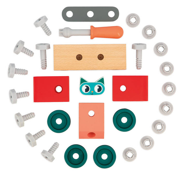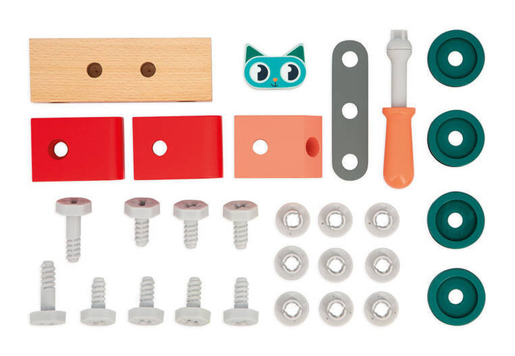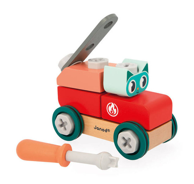 Drewniany wóz strażacki Kot do samodzielnego składania z serii Brico'Kids francuskiej marki JANOD to idealny prezent dla małego majsterkowicza. Zestaw składa się z 27 elementów do zbudowania pojazdu, w tym śrubek oraz śrubokręta – narzędzia, niezbędnego przy tworzeniu konstrukcji. Jedną z części jest kierowca-kot. Zabawka wspomaga rozwój dziecka na wielu płaszczyznach: rozwija zdolności manualne, precyzję ruchów, cierpliwość, koncentrację, stymuluje wyobraźnię i zachęca do tworzenia historii oraz odgrywania sytuacji, znanych z obserwacji dorosłych. Do zestawu dołączana jest karta z instrukcją złożenia auta krok po kroku.