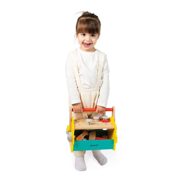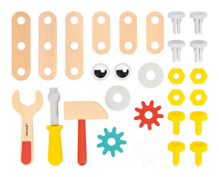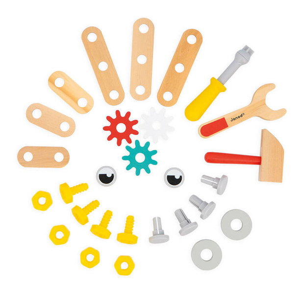 Drewniana skrzynka z narzędziami Robot z serii Brico'Kids francuskiej marki JANOD to idealny prezent dla małego majsterkowicza. Zestaw składa się z poręcznej skrzynki z uchwytem na narzędzia, ozdobionej oczami i uśmiechem robota oraz kompletu śrubek, nakrętek, podkładek oraz kół zębatych, młotka, klucza i śrubokręta. Zabawka wspomaga rozwój dziecka na wielu płaszczyznach: rozwija zdolności manualne, precyzję ruchów, cierpliwość, koncentrację, stymuluje wyobraźnię i zachęca do tworzenia historii oraz odgrywania sytuacji, znanych z obserwacji dorosłych.
