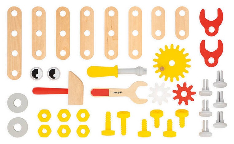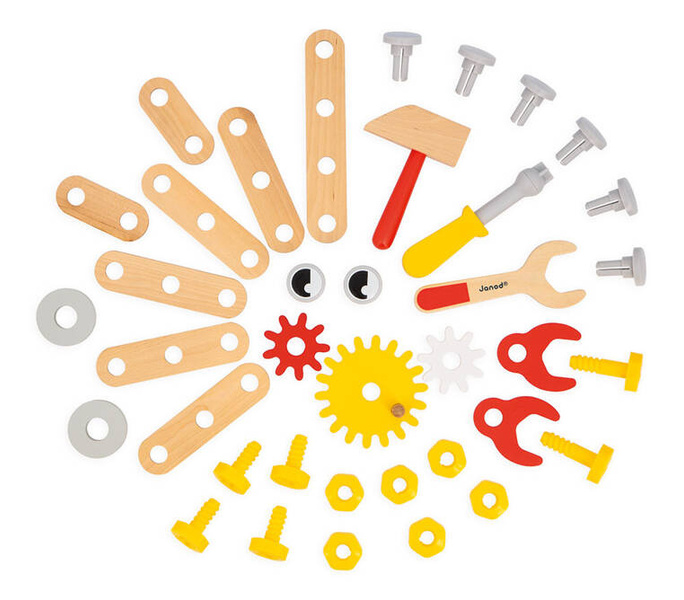 Drewniany, w pełni wyposażony wózek z narzędziami Robot z serii Brico'Kids francuskiej marki JANOD to idealny prezent dla małego majsterkowicza. Zestaw składa się z 38 elementów: wózka z na 4 nierysujących podłogi kółkach oraz z uchwytem do prowadzenia, ozdobionego oczami i uśmiechem robota, wraz z kompletem śrubek, nakrętek, podkładek oraz kół zębatych, młotka, klucza i śrubokręta. Narzędzia są magnetyczne i przyczepiają się do ścianki wózka-warsztatu. Jest on wyposażony w blat roboczy, boczne imadło oraz dolną półkę do przechowywania. Może się nim bawić jednocześnie więcej niż jedno dziecko.