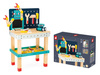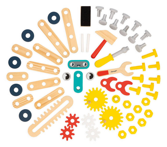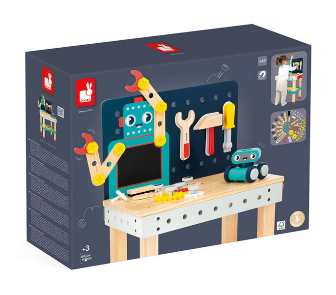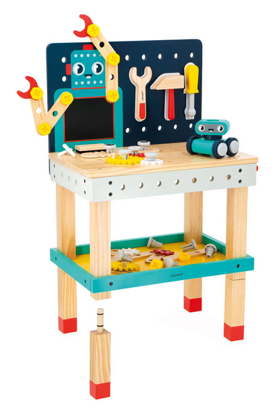 Drewniany, w pełni wyposażony stolik warsztatowy z narzędziami Robot z serii Brico'Kids francuskiej marki JANOD to idealny prezent dla małego majsterkowicza. Zestaw składa się z 60 elementów: stołu na 4 stabilnych nogach ze ścianką, ozdobioną wizerunkiem robota i mini-tablicą na projekty lub notatki, wraz z kompletem śrubek, nakrętek, podkładek oraz kół zębatych, młotka, klucza i śrubokręta. Narzędzia są magnetyczne i przyczepiają się do ścianki warsztatu. Ponadto jest on wyposażony w blat roboczy, boczne imadło oraz dolną półkę do przechowywania. Może się nim bawić jednocześnie więcej niż jedno dziecko.