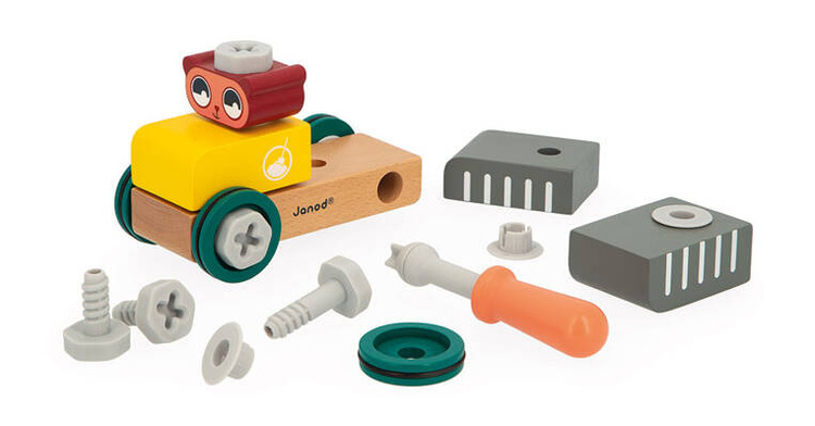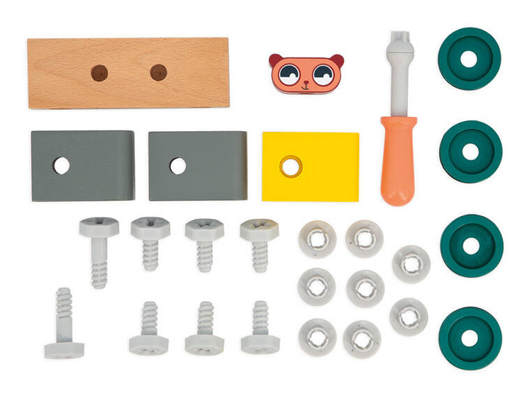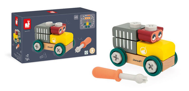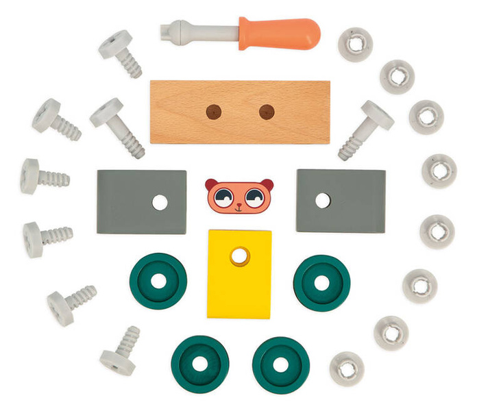 Drewniana cysterna Miś do samodzielnego składania z serii Brico'Kids francuskiej marki JANOD to idealny prezent dla małego majsterkowicza. Zestaw składa się z 25 elementów do zbudowania pojazdu, w tym śrubek, nakrętek, podkładek oraz śrubokręta – narzędzia, niezbędnego przy tworzeniu konstrukcji. Jedną z części jest kierowca-miś. Zabawka wspomaga rozwój dziecka na wielu płaszczyznach: rozwija zdolności manualne, precyzję ruchów, cierpliwość, koncentrację, stymuluje wyobraźnię i zachęca do tworzenia historii oraz odgrywania sytuacji, znanych z obserwacji dorosłych. Do zestawu dołączana jest karta z instrukcją złożenia auta krok po kroku.