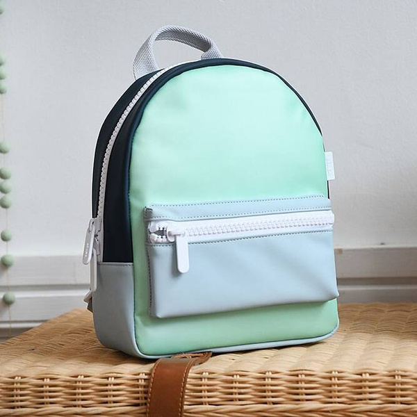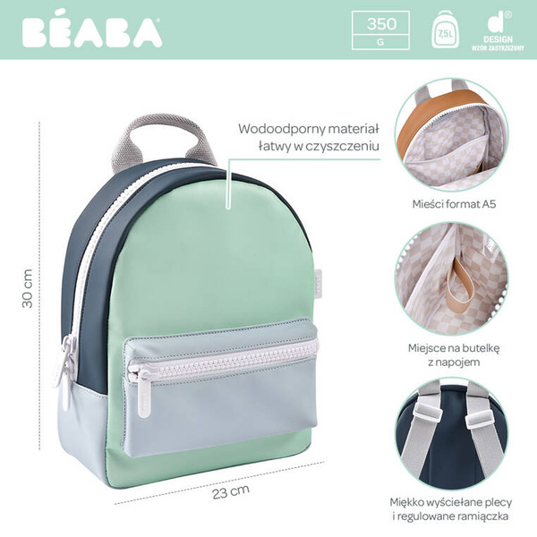 Praktyczny, wygodny i lekki plecak Faro dla dziecka francuskiej marki BEABA. Stworzony z myślą o maluszkach do 5 lat. Wytrzymały i stylowy. Wykonany z wodoodpornej, łatwej do czyszczenia ekologicznej gumy. Bez trudu pomieści wszystkie niezbędne rzeczy dziecka. W komorze głównej ma oddzielną kieszonkę na zeszyt, książkę czy zabawkę, a także szeroką gumkę na bidon lub butelkę z napojem oraz etykietkę z wizytówką, na której można zapisać imię dziecka i numer kontaktowy rodzica. Dodatkowo ma również zapinaną na suwak kieszonkę zewnętrzną z przodu. Jego całkowita pojemność to 7,5 l. Plecak ma wyściełane plecki dla wygody noszenia, rączkę i szerokie regulowane ramiączka. Utrzymany jest w stonowanej kolorystyce (ciemny granat, bardzo jasny niebieski, jasna pastelowa zieleń i szarość + szerokie białe suwaki), z dbałością o detale (podszewka w stylową kratkę, uchwyty suwaków z wypukłym logo).
