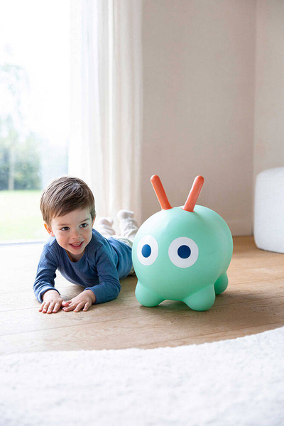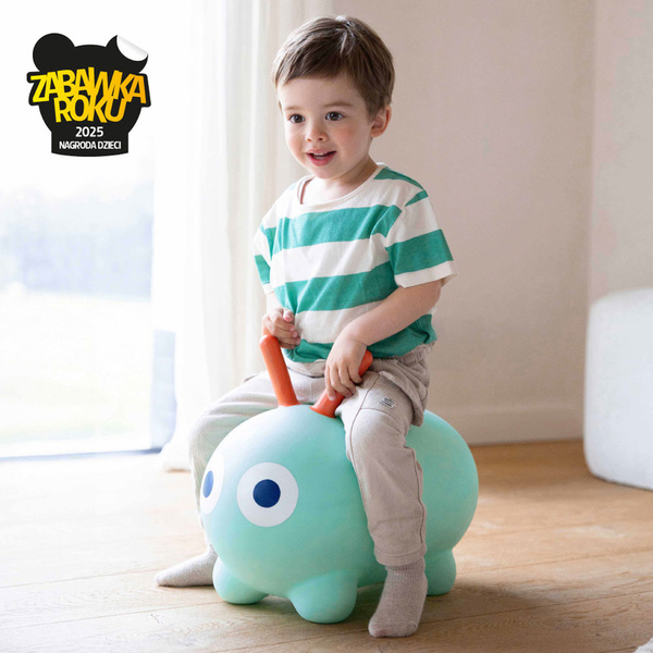 Oryginalny, sporych rozmiarów dmuchany skoczek Skippi belgijskiej marki Quut to świetna i rozwojowa rozrywka dla aktywnych maluchów. Idealny do domu, ogrodu lub na taras. Łatwy do napompowania (pompka w zestawie) i transportu. Skoczek przeznaczony jest dla dzieci od 1. roku życia (siedzisko na wysokości 25 cm). Wykonany został z bardzo wytrzymałego winylu, zachwyca niebanalnym designem i kolorystyką. Ma kształt wydłużonej (idealnej do siedzenia) uroczej gąsienicy z długimi czułkami, które mogą służyć za poręczne uchwyty podczas zabawy oraz piękne, intensywne kolory: jest miętowy, a jego czułka – koralowe. Zabawka nadaje się idealnie do treningu równowagi, panowania nad własnym ciałem, koordynacji ruchowej i siły mięśni. Nadaje się także do relaksu na świeżym powietrzu. Pobudza wyobraźnię i kreatywność, zachęca do aktywności, zdobywania nowych doświadczeń i umiejętności.
