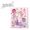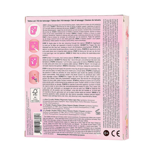 Zestaw do tworzenia zmywalnych tatuaży brokatowych dla dzieci holenderskiej marki Souza! Zawiera 12 wzorników z motywami, m.in. zamkiem, karocą i koroną, nietoksyczny klej, dwa pojemniczki z brokatem (różowym i fioletowym) oraz aplikator do ich nakładania. Dołączona do zestawu instrukcja krok po kroku wyjaśnia, jak wykonać tatuaż.