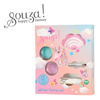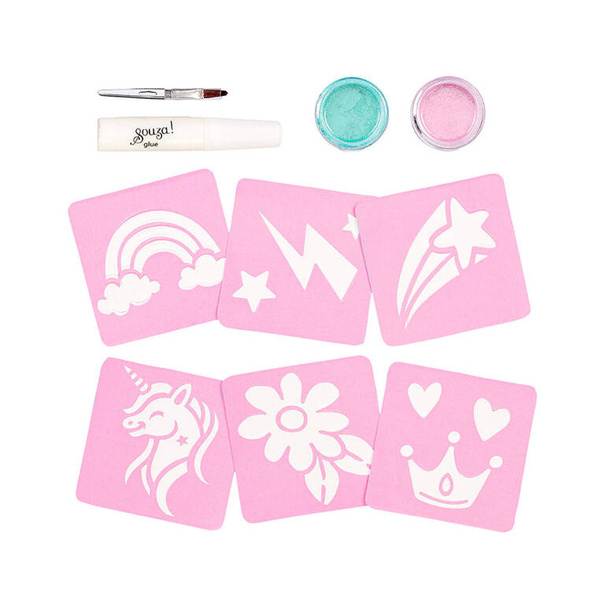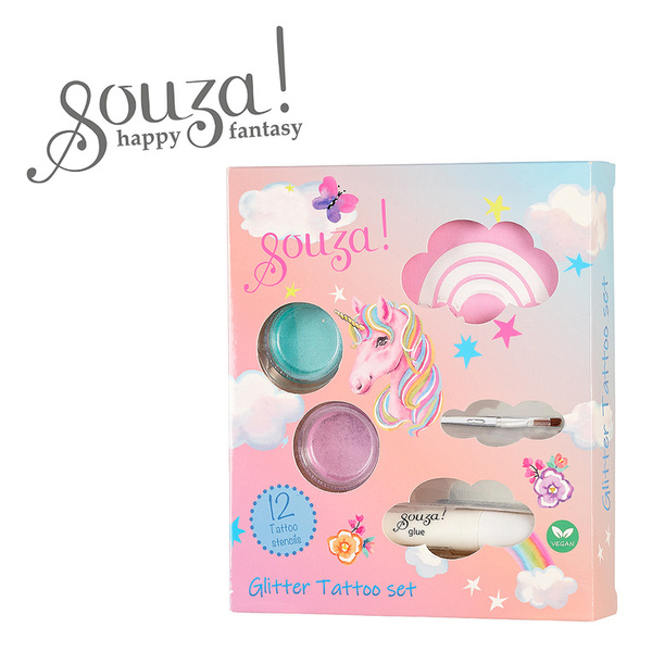 Zestaw do tworzenia zmywalnych tatuaży brokatowych dla dzieci holenderskiej marki Souza! Zawiera 12 wzorników z motywami, m.in. jednorożcem, tęczą i koroną, nietoksyczny klej, dwa pojemniczki z brokatem (różowym i turkusowym) oraz aplikator do ich nakładania. Dołączona do zestawu instrukcja krok po kroku wyjaśnia, jak wykonać tatuaż.