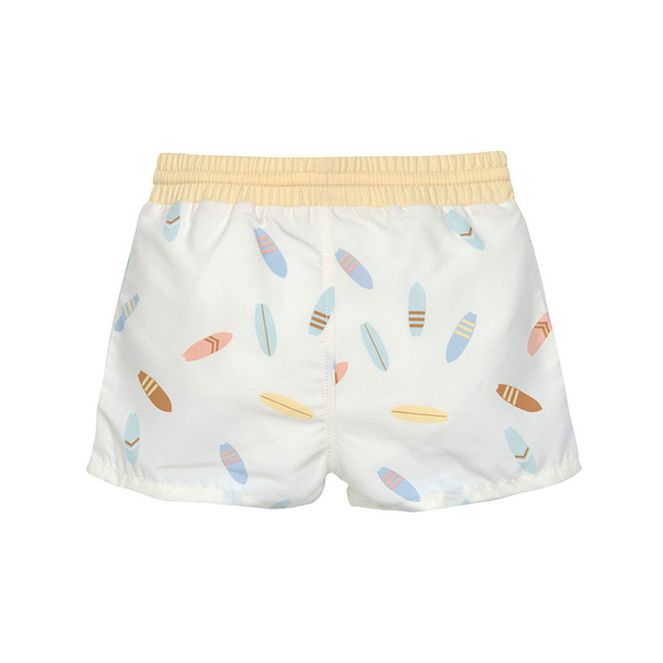 Jasne (écru) szorty z łososiowym pasem zdobi wzór w kolorowe deski surfingowe. Produkt jest częścią większej kolekcji. Możesz dobrać do niego inny z tym samym wzorem lub w podobnej kolorystyce.