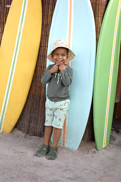 Kolekcja Splash & Fun to seria produktów, przeznaczonych do kąpieli i spędzania dnia na plaży czy basenie. Wszystkie elementy garderoby – pieluszki, szorty, koszulki czy nakrycia głowy – są szybkoschnące i doskonale chronią delikatną skórę dziecka przed promieniowaniem UV. Dodatkowo są komfortowe w noszeniu i użytkowaniu oraz wyróżniają się niebanalną kolorystyką.