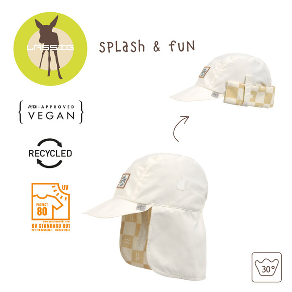 Praktyczna i komfortowa czapka przeciwsłoneczna z kolekcji Splash & Fun niemieckiej marki LASSIG. Wykonana jest z miękkiej, przyjemnej do noszenia i szybkoschnącej tkaniny z filtrem UV 80. Ma daszek i rozwijany dłuższy tylny panel, dodatkowo chroniący kark. Idealna zarówno na odkryty basen, jak i na plażę, do kąpieli w jeziorze czy morzu oraz wszelkich wodnych zabaw. Dzięki bocznym zapięciom na rzep tylny panel można wygodnie zwinąć i zamocować przy czapce. Nie przemaka i jest łatwa w pielęgnacji.