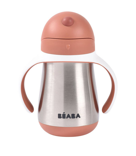 Pojemna, poręczna i lekka butelka ze słomką francuskiej marki BEABA wykonana została ze stali nierdzewnej, odpornej na korozję, zarysowania, wgniecenia i zanieczyszczenia. Dzięki podwójnym stalowym ściankom, butelka długo zachowuje temperaturę napojów, zarówno ciepłych (do 6h), jak i zimnych (do 7h). Ergonomiczny kształt, wygodny dla dziecięcych rączek oraz dodatkowy zdejmowany uchwyt z dwoma uchami ułatwiają malcowi samodzielne trzymanie. Wymienna silikonowa słomka posiada zawór, dzięki któremu butelka pełni funkcję kubka niekapka. Słomka jest profilowana i umocowana w zakrętce, co zapewnia jej stabilną pozycję i odpowiedni przepływ powietrza podczas picia. Zamknięcie – zintegrowana klapka na klik – jest szczelne, bezpieczne i higieniczne, a przy tym łatwe do samodzielnego otwierania i zamykania przez dziecko. Butelka przeznaczona jest dla dzieci od 8. miesiąca życia i pomaga w nauce samodzielnego picia.