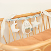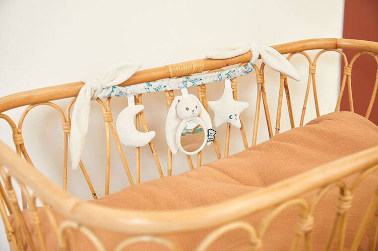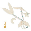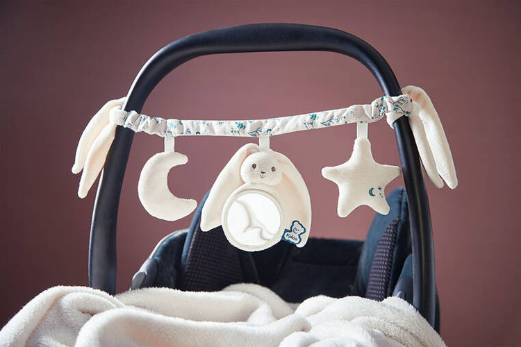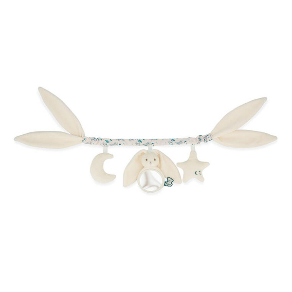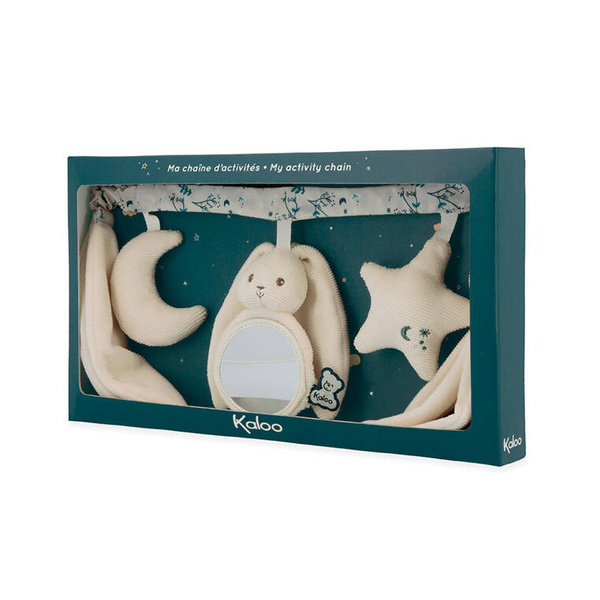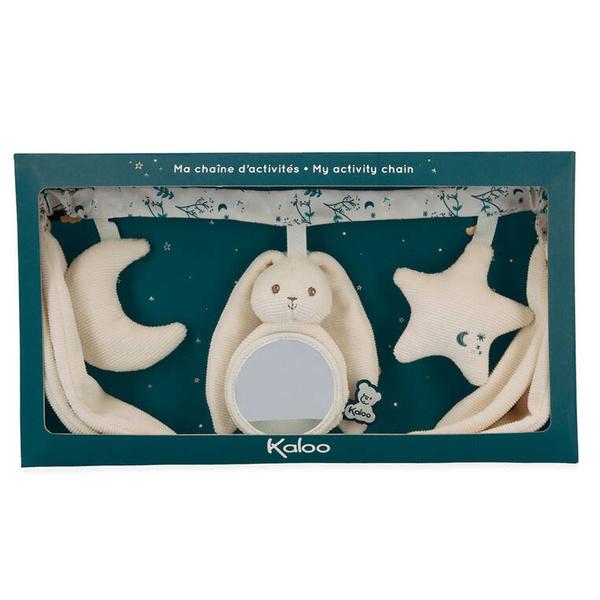Miękki sensoryczny łańcuch aktywizujący z trzema urokliwymi zawieszkami francuskiej marki KALOO to idealna zabawka dla Twojego dziecka, bezpieczna już od pierwszych dni życia. Jest piękna i perfekcyjnie wykończona. Utrzymana w bardzo jasnym kremowym kolorze. Ma długie zakończenia po obu stronach, imitujące królicze uszy, dzięki czemu łatwo się ją mocuje do ramy wózka, fotelika czy łóżeczka, po prostu wiążąc je na supeł. Zawieszki pełnią różne funkcje: księżyc szeleści przy dotykaniu, brzuszek króliczka to bezpieczne lusterko, wspierające rozwój zmysłu wzorku, a gwiazdka to grzechotka. Łańcuch wykonany został z przyjemnego w dotyku weluru o fakturze drobnego sztruksu. Wspiera naukę chwytania i rozwój sensoryczny, aktywizuje również zmysł dotyku i słuchu.