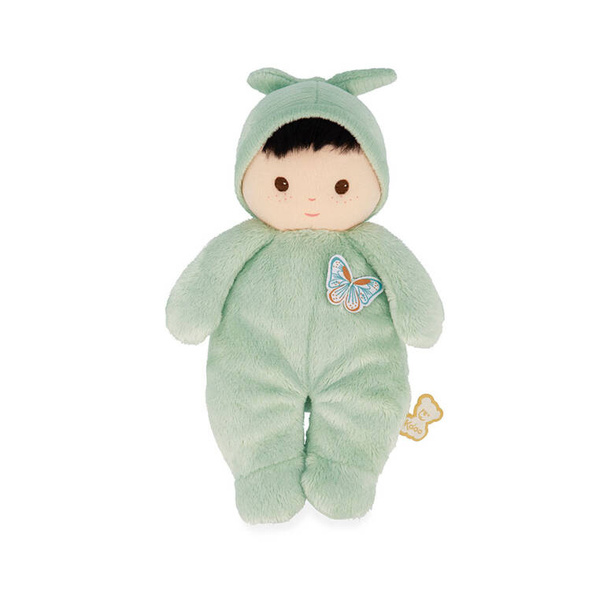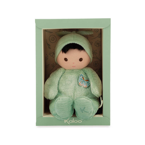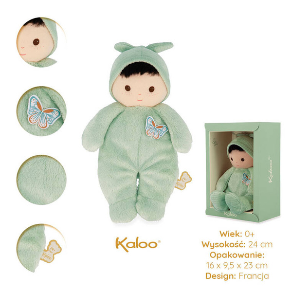 Urocza lalka-niemowlę Pilea z kolekcji Tendre Bebe francuskiej marki KALOO to idealna pierwsza przyjaciółka Twojego maluszka. Jest niezwykle miękka, perfekcyjnie wykończona i bezpieczna dla dziecka już od pierwszych dni jego życia. Ma łagodną minkę, ciemnobrązowe oczka i taką samą uroczą grzywkę. Ubrana w pastelowo zielone puchate ubranko: śpioszki oraz czapeczkę ze stymulującym sensorycznie supełkiem i dłuższymi uszkami. Jej imię – Pilea – symbolizuje dobrobyt, obfitość i szczęście. Na wysokości serca ma naszywkę motyla. Mierzy 24 cm i jest poręczna dla małych rączek. Stworzona do tulenia, usypiania, uspokajania czy towarzyszenia w ważnych chwilach.