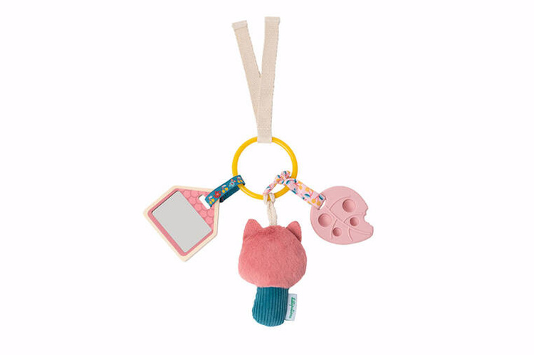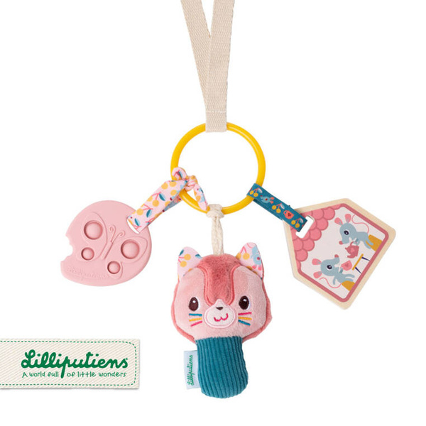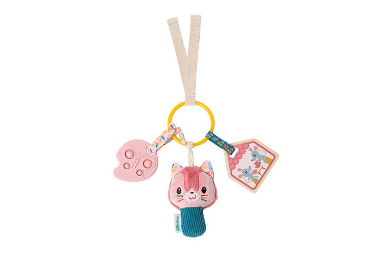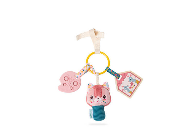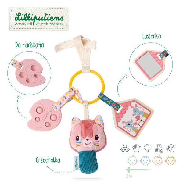 Wielofunkcyjny brelok-zawieszka aktywizująca z kolekcji Kotka Jeanne belgijskiej marki Lilliputiens to niebanalna pierwsza zabawka maluszka. Na kółeczku zamocowane są trzy elementy: silikonowy pop-it z motylkiem, tekstylna grzechotka Kotka Jeanne oraz drewniany mysi domek z lusterkiem. Kółko ma mocowanie z szerokiej taśmy, dzięki czemu b reloczek można zawiązać przy wózku, nosidełku, foteliku czy barierce łóżeczka. Zabawka jest solidnie wykonana i bezpieczna. Rozwija koordynację ręka-oko, małą motorykę (chwytanie, przesuwanie, potrząsanie, wciskanie), zmysł słuchu (grzechocze, pstryka), wzroku (lusterko) i dotyku (faktury, materiały).