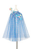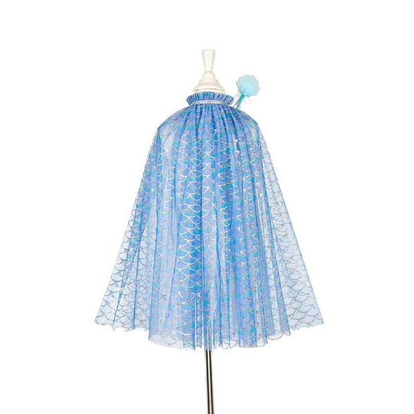 Kostium peleryna z akcesoriami (opaską i różdżką) syrenka Marlya holenderskiej marki Souza! to przepiękne, kunsztownie wykonane przebranie dla dziewczynki. Peleryna zachwyca dbałością o detale. Jest efektowna, z niebieskiego tiulu z połyskującym nadrukiem wzoru, imitującego syrenie łuski. Zapinana pod szyją na nap i obszyta srebrzącą się tasiemką wokół stojącego kołnierzyka. W zestawie z peleryną znajduje się też lekka opaska, obciągnięta niebieską tkaniną i zdobiona sporymi aplikacjami: ogonem, gwiazdkami czy muszlami, jak również syrenia różdżka – fioletowa z upięciem z niebieskiego tiulu oraz brokatową muszlą w odcieniach tęczy. Zestaw stanowi idealne uzupełnienie stroju syrenki lub samodzielny kostium na bal przebierańców czy Sylwestra. Sprawdzi się także jako prezent.