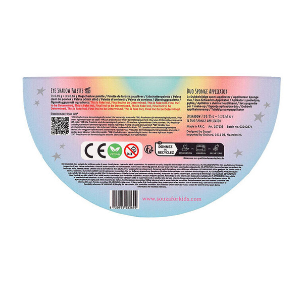Paleta z lusterkiem i zestawem cieni do powiek dla dzieci Jednorożec holenderskiej marki Souza! Zawiera 10 kolorów cieni do powiek w pięknych kolorach: żółtym, brązowym oraz kilku odcieniach różu i turkusu. W zestawie znajduje się też aplikator z dwoma gąbeczkami.