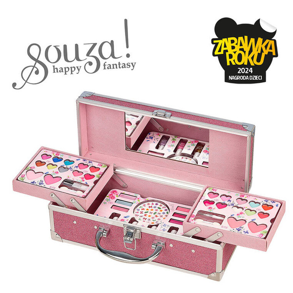Duży zestaw kosmetyków do makijażu dla dzieci w rozkładanej, dwupoziomowej walizce z lusterkiem holenderskiej marki Souza! Zawiera: 4 lakiery do paznokci, 11 kremowych szminek/błyszczyków, 15 cieni do powiek w pięknych kolorach, 4 róże do policzków oraz arkusz drobnych naklejek na paznokcie. W zestawie znajdują się też 2 podwójne aplikatory z gąbeczkami i 2 delikatne pędzelki.