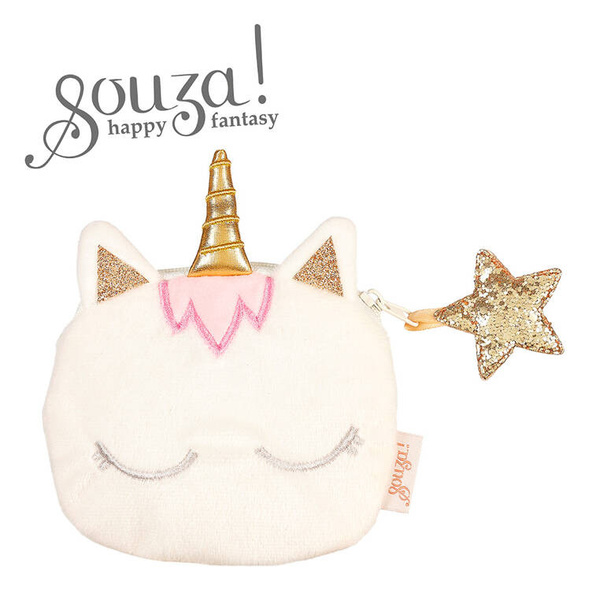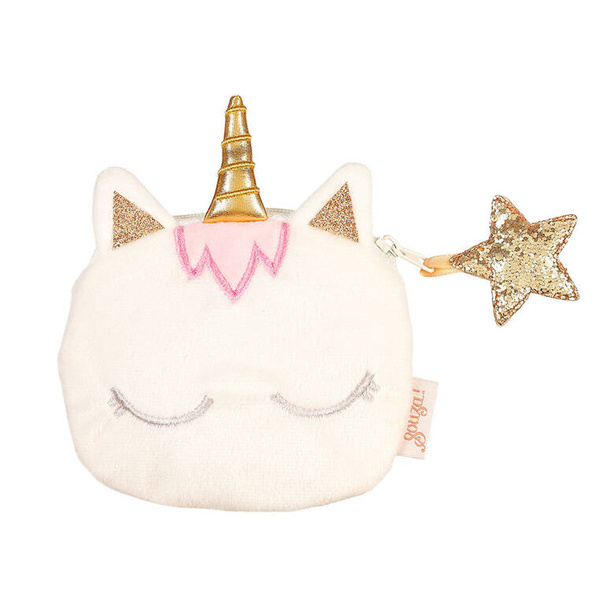 Portfelik dla dzieci Jednorożec Merit holenderskiej marki Souza! to uroczy i praktyczny dodatek. Wykonany jest z przyjemnego w dotyku futerka w kolorze złamanej bieli, ma uszka, haftowaną różową grzywkę, złoty róg i zamknięte oczy. Zapinany na suwak ze złotą, cekinową gwiazdką przy uchwycie. Sprawdzi się do przechowywania kieszonkowego, kluczy czy innych niezbędnych drobiazgów. Idealny do noszenia na co dzień, np. w plecaku lub torebce. Nadaje się także na prezent.
