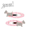 Komplet dwóch spinek do włosów z brokatowymi pieskami holenderskiej marki Souza! Na każdej z nich znajduje się srebrna aplikacja pieska w typie sznaucera z różową obrożą. Metalowa część obciągnięta jest wokół różowym materiałem w kropeczki. Zaciski na klik sprawiają, że ozdoby stabilnie trzymają się włosów. Idealne zarówno na przyjęcia, jak i na co dzień. Nadają się także na prezent.