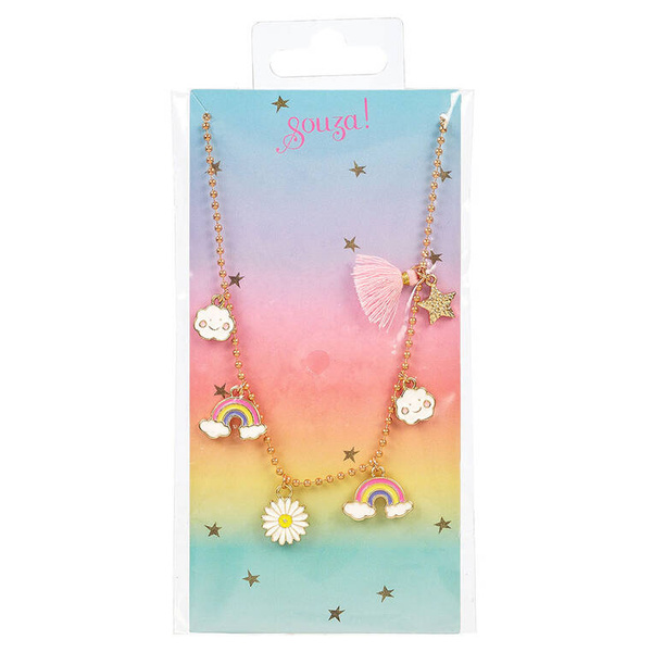 Złoty naszyjnik z zawieszkami Niebo holenderskiej marki Souza! To ozdobny łańcuszek z małych kuleczek z 6 ozdobnymi zawieszkami w kształcie: tęczy, uśmiechniętych chmurek i kwiatka oraz z ozdobnym różowym chwostem z małą gwiazdką. Naszyjnik ma długość 36 cm.